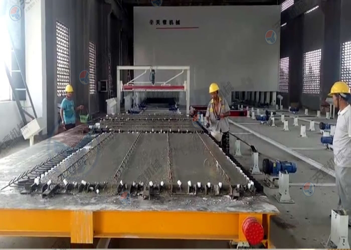 PC環(huán)形疊合板/內(nèi)墻板生產(chǎn)線的主要設(shè)備包括雙梁橋式起重機、清理機、脫模劑噴涂機、布料機、振動臺、趕平機、拉毛裝置、預(yù)養(yǎng)窯、抹光機、碼垛車、養(yǎng)護窯、翻轉(zhuǎn)機、擺渡車、支撐滾輪、驅(qū)動輪、模臺和成品運輸車等。